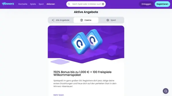 Unser Haupt-Willkommensdeal im Casino umfasst zwei Einzahlungsboni. Erste Einzahlung: 100% bis zu €500 plus 100 Freispiele, mit einer Mindesteinzahlung von €20 und 25x Umsatz auf (Bonus + Einzahlung), ohne Promocode. Zweite Einzahlung: 50% bis zu €500, ebenfalls mit einer Mindesteinzahlung von €20 und 25x Umsatz auf (Bonus + Einzahlung). Zusätzlich bieten wir ein separates Sport-Willkommensangebot: 100% bis zu €200 auf Ihre erste Sporteinzahlung. Wenn Sie nach einem Winnerz Bonus mit klaren Bedingungen suchen, ist diese Struktur bewusst leicht nachvollziehbar. Derzeit bewerben wir auf unserer Promotions-Seite keinen Winnerz Casino Bonus ohne Einzahlung.